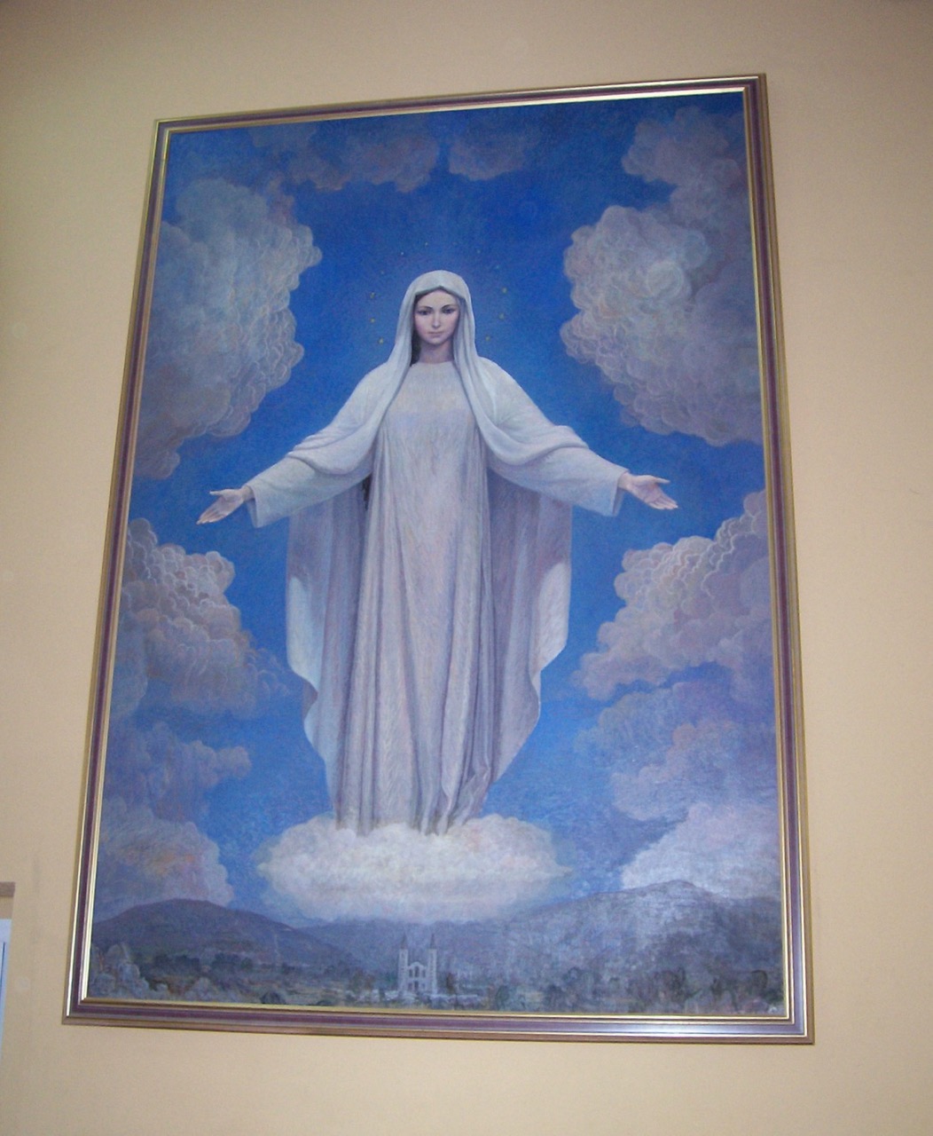 Gospa has appeared every day since June 24, 1981. The visionaries say she appears to be 18 to 19 years old, is beautiful beyond description; she has dark hair, blue eyes and rosy cheeks. She always comes with twelve stars around her head and hovers above the ground. Sometimes she is accompanied by angels.